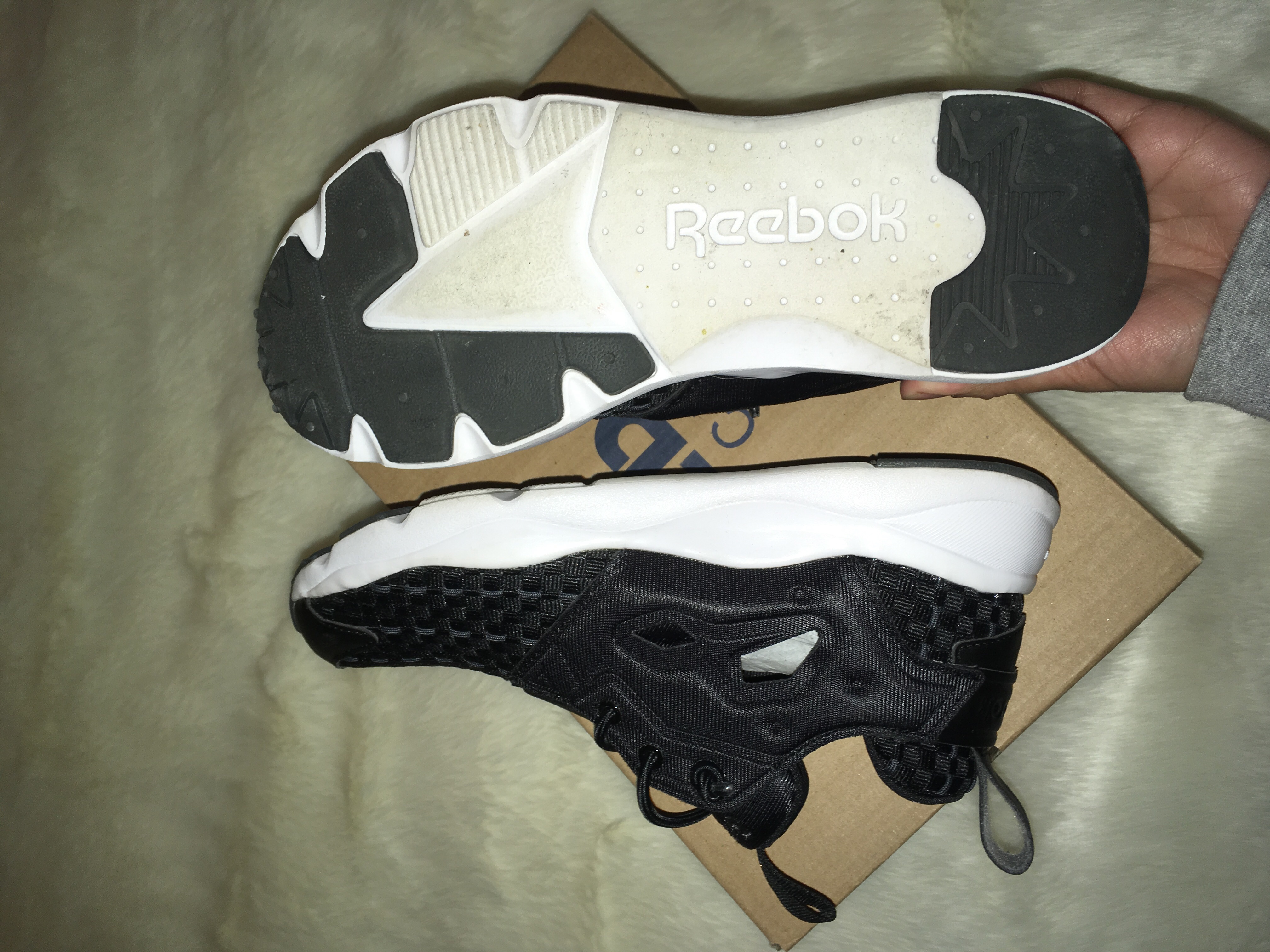 Worn lightly 2 times (4th photo shows the wear) Brand: Reebok Color: Black/Solid Gray/White Size: 5 Box included RV: $74.99